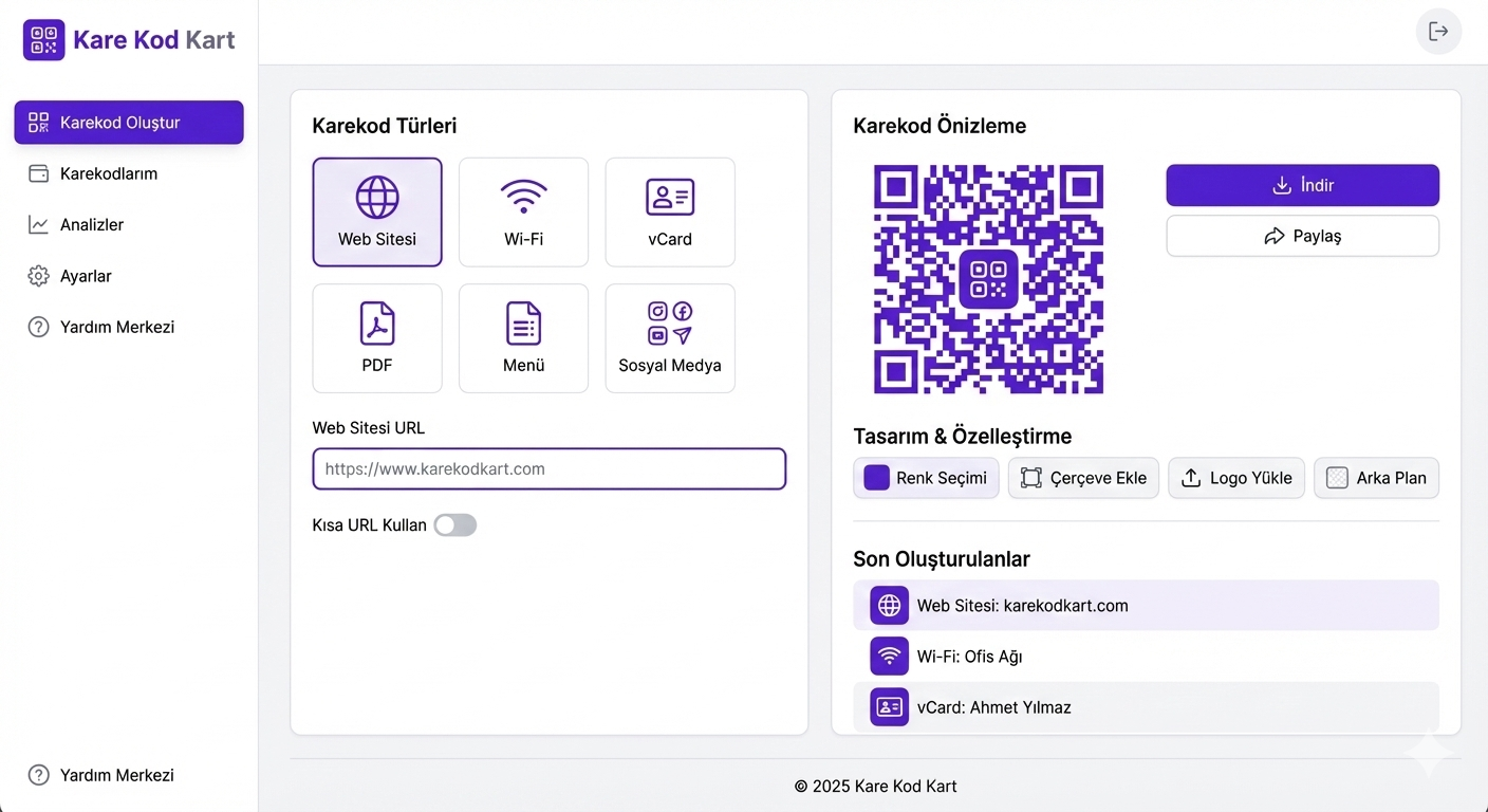 Oluşturduğunuz karekodlar ekran görüntüsü kalitesinde değil, 300 DPI matbaa kalitesinde oluşturulur. A4, A5, Masaüstü veya Etiket baskılarında asla bozulmaz, pikselleşmez.